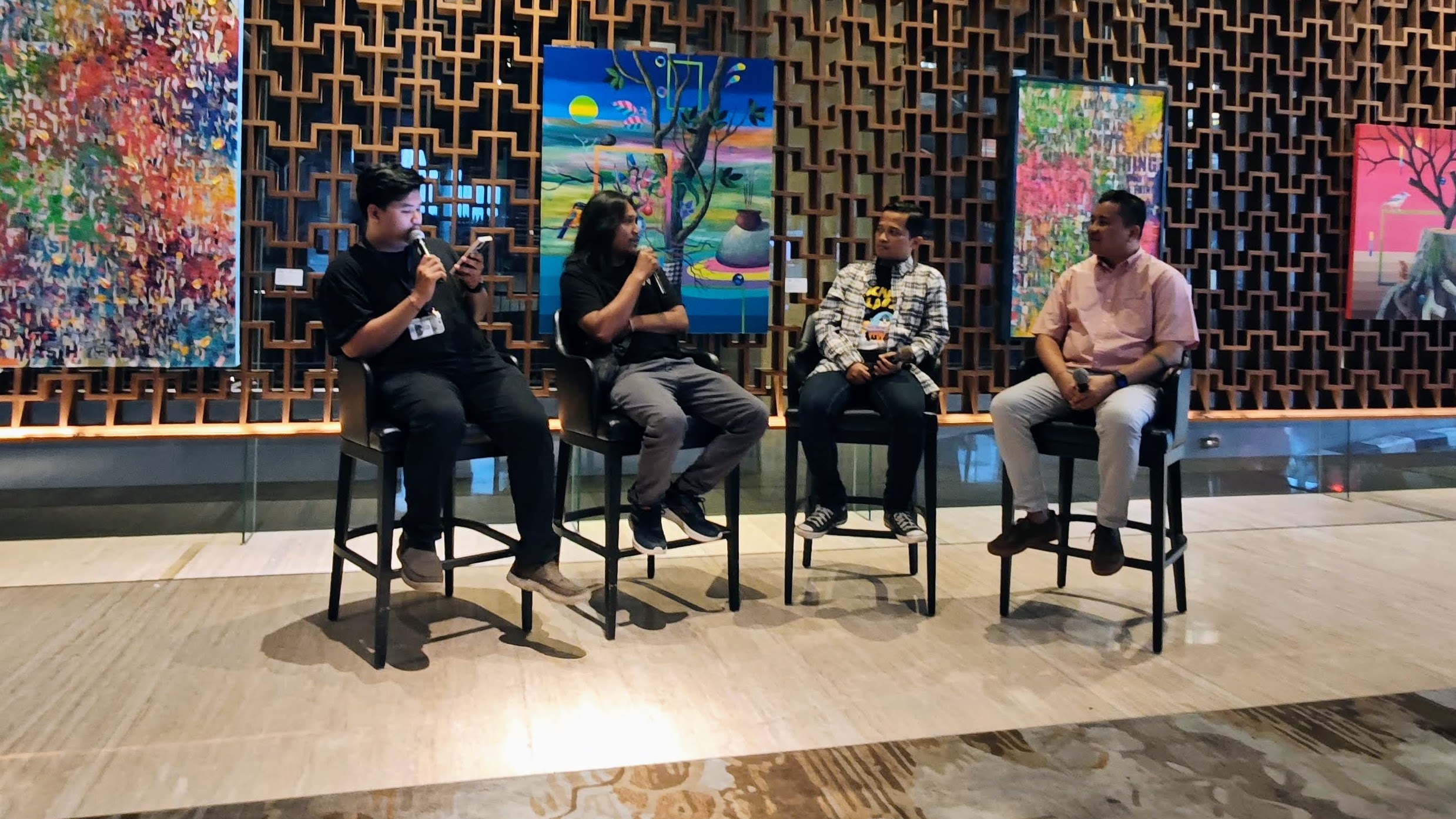 “Secara visual, ada harmoni dari pilihan warna dan unsur alam yang kompleks—ada tanaman, hewan, hingga matahari. Kehadiran karya ini memberikan aura positif dan ‘magis’ yang menyatu dengan suasana lobi kami,” imbuhnya.