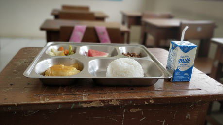 Ilustrasi menu MBG di sekolah. (ai image generator)
