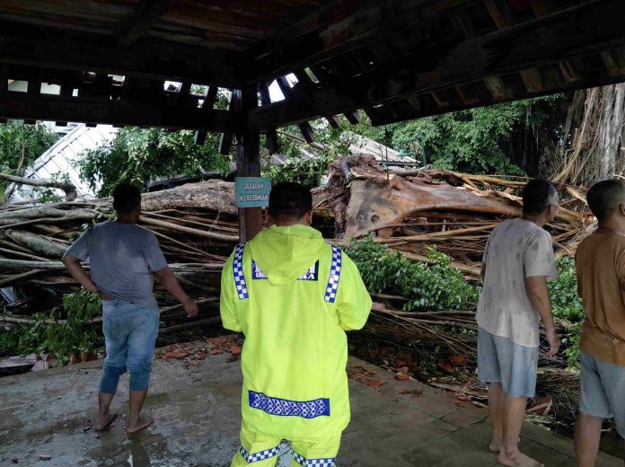 Pohon beringin berusia lebih dari satu abad yang berdiri kokoh di pintu masuk Masjid Gede Mataram ambruk seketika, menimpa bangunan pendopo, warung makan, serta deretan kendaraan.