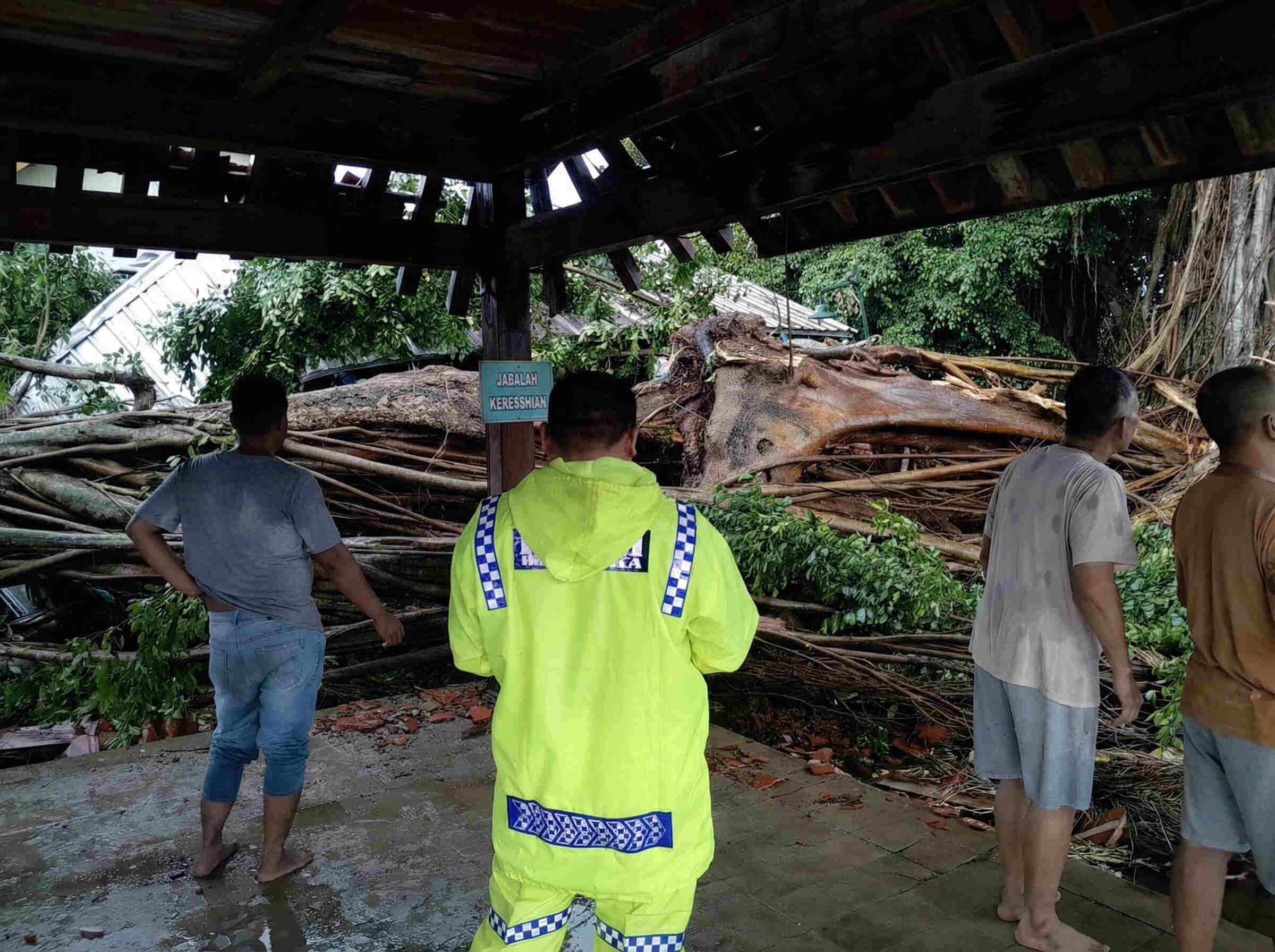 Beruntung, posisi jatuhnya pohon berada di tengah area kosong sehingga tidak mengenai warga yang sedang berteduh di pinggir bangunan, memastikan tidak adanya korban jiwa dalam insiden ini.